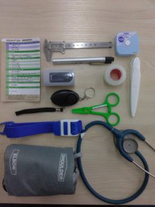 バイタルサインをチェックするのにかかせないセットだけではなく、傷のサイズを測る物差しやメジャー、ペンライト、点滴などをする時のために駆血帯などなど…。