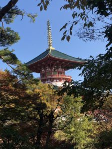 平和大塔から下に広がる成田山公園では、紅葉の真っ盛りで、中央付近の大きな池には